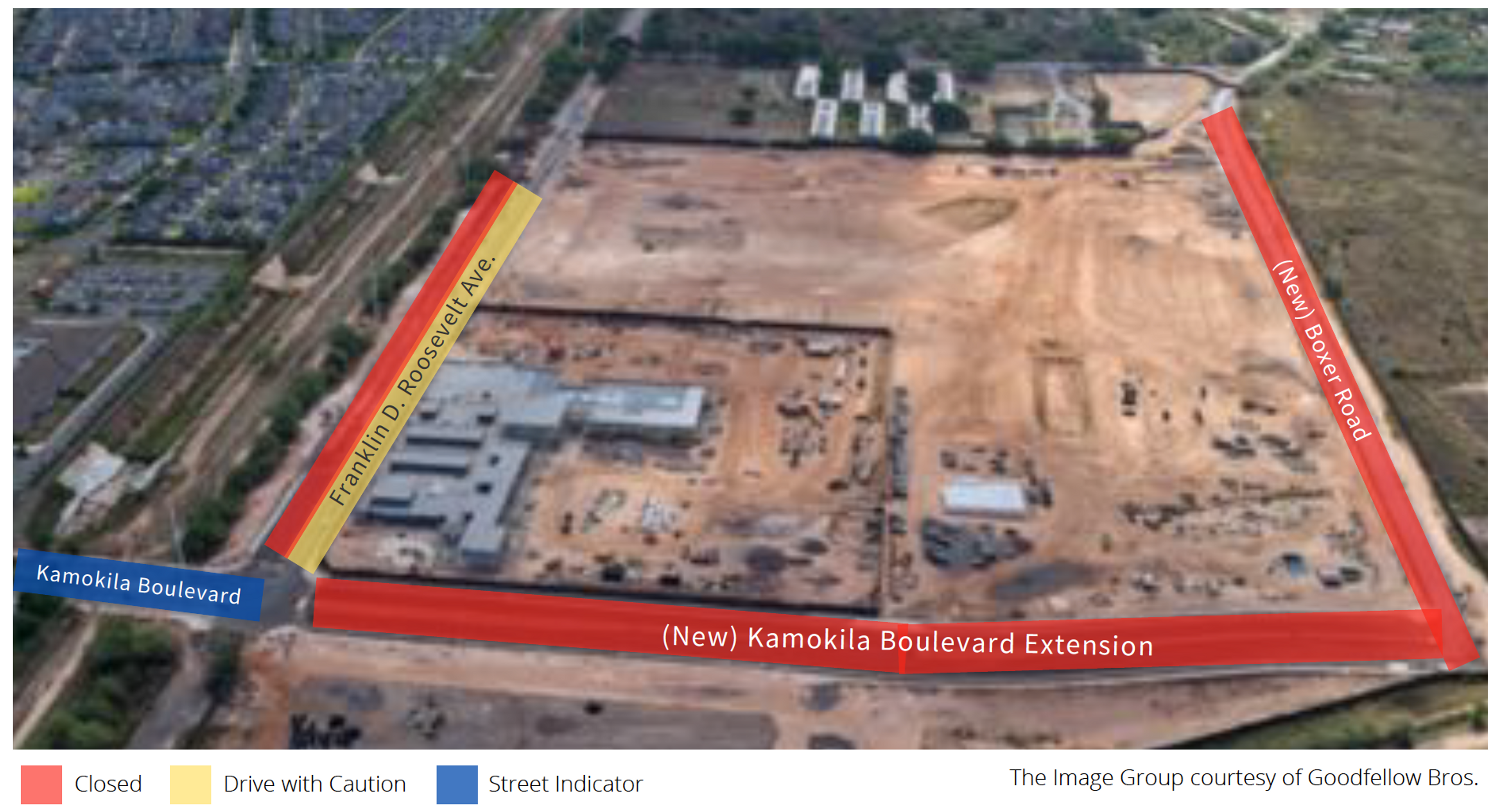 Improvements to Franklin D. Roosevelt (FDR) Avenue are ongoing. Two new mauka (mountainside) lanes of FDR Ave. will remain closed to ensure the safety of contractors while they continue construction. Two makai (oceanside) lanes are open for public access. Additionally, Hunt contractors have made significant progress on the Kamokila Boulevard extension and Boxer Road relocation. FDR Ave., the Kamokila Blvd. extension, and the new Boxer Road are scheduled to open to the public early next year.